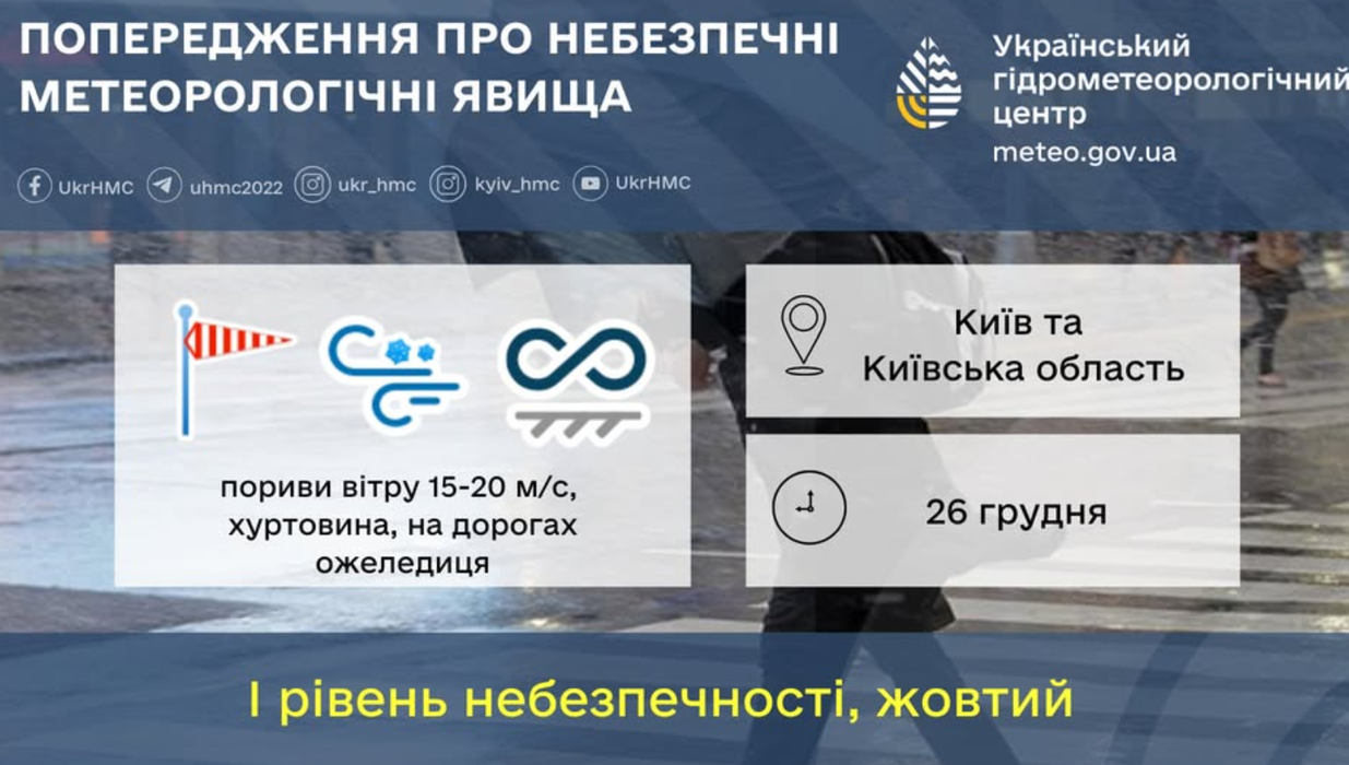 "Завтра, 26 грудня, в Києві очікуються пориви вітру 15-20 м/с та хуртовини, на дорогах ожеледиця", - повідомляє КМДА
