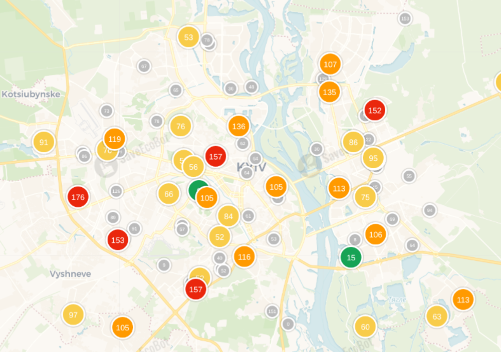 - Святошинський район, вулиця Якуба Коласа, 2. Індекс забрудення - 170