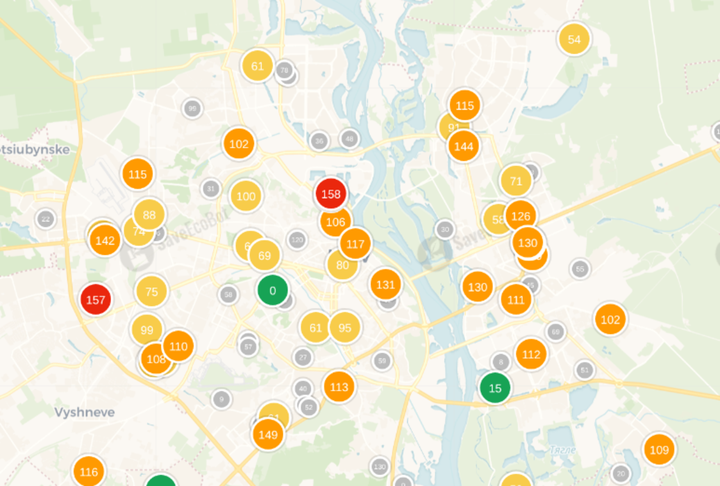 Сьогодні вдень найгірший стан повітря в центрі міста та на Правому березі. Наразі тут зафіксовані рекордні показники забруднення, відмічені червоним кольором: