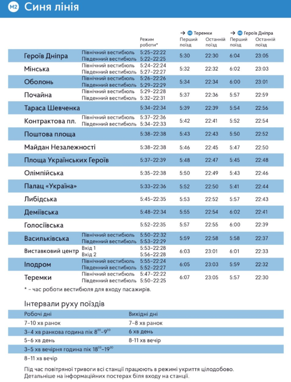 Детальна інформація про час відкриття та закриття кожної станції метро на вхід та вихід наведена в інфографіці.