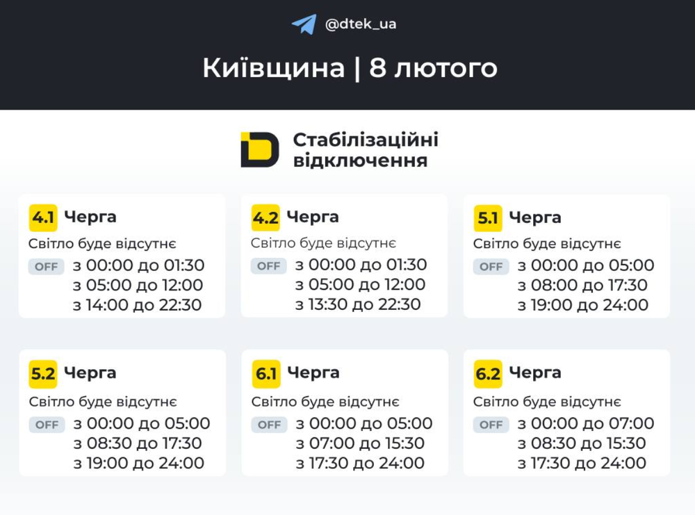 "В разі змін будемо вас інформувати в нашому телеграм-каналі. Підписуйтесь та поділіться, будь ласка, з друзями та родичами", - повідомляє ДТЕК.