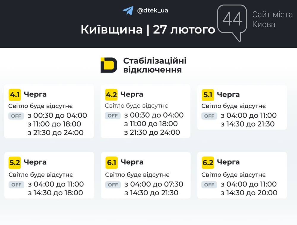 Сьогодні, 27 лютого, на Київщині діятимуть стабілізовані відключення світла. Про це повідомляє ДТЕК.