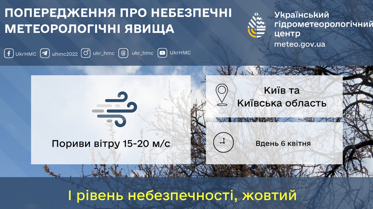 "6 квітня вдень у Києві очікуються пориви вітру 15-20 м/с", - повідомляє Укргідрометцентр, як пише КМДА