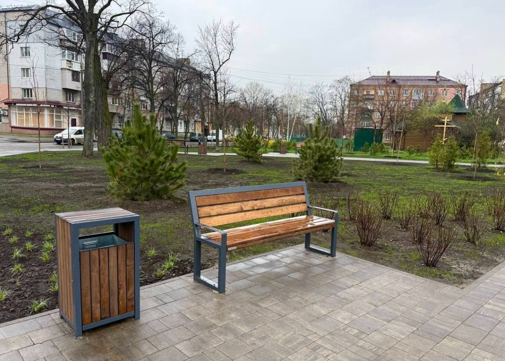 - Гранітне покриття навколо меморіальної зони, встановлено лави та урни.