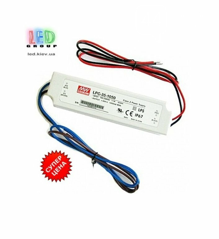 Блок живлення 3,0 ... 30,0V, 1050mA, 35W, Mean Well, LPC-35-1050, пластиковий корпус, IP67