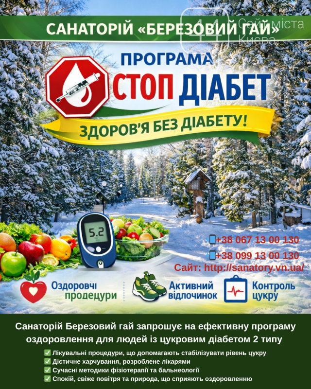 Санаторій "Березовий гай" запрошує на ефективну програму оздоровлення для людей із цукровим діабетом 2 типу (стадія компенсації та субкомпенсації).