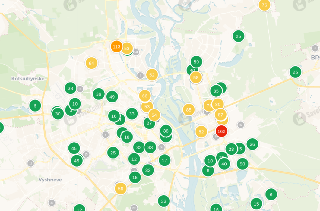 - Оболонский район, улица Миропольская, 13А Показатель загрязнения – 104