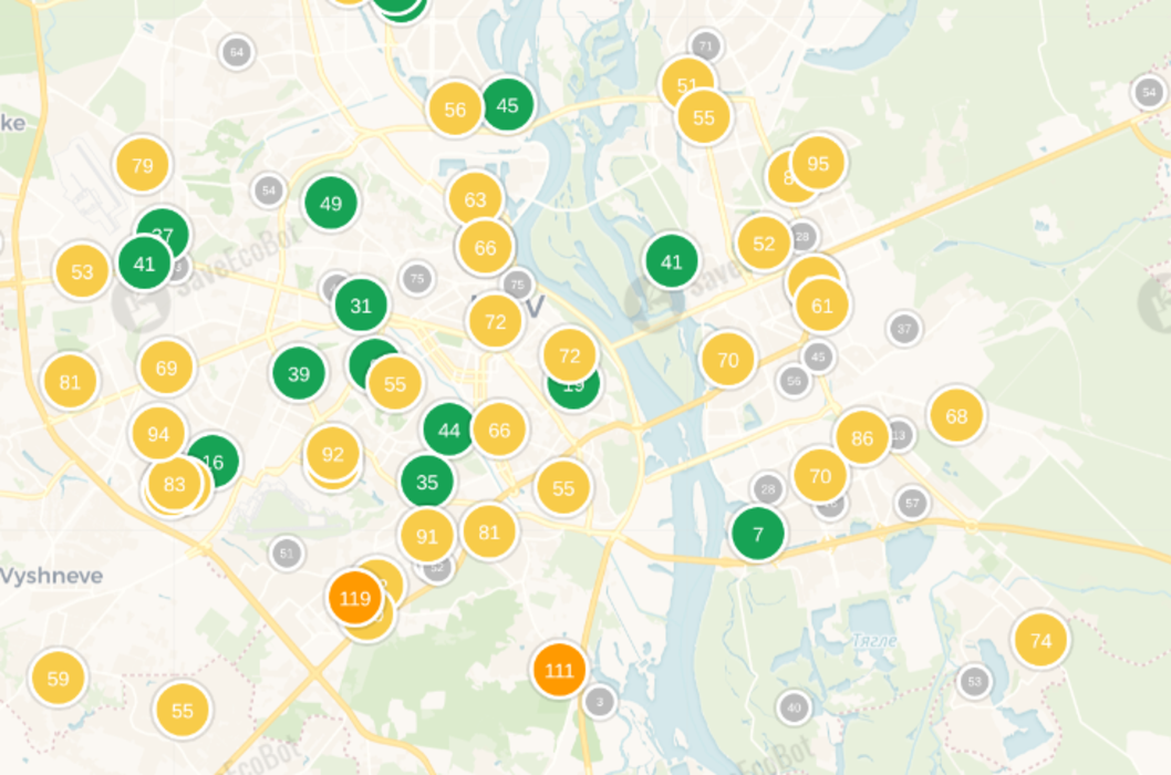 В этот вечер по всему Киеву следует закрывать окна. Датчики уличного мониторинга зафиксировали смог. Пока высокое содержание вредных веществ в воздухе преобладает только на Правом берегу города, а именно по двум адресам в Голосеевском районе: