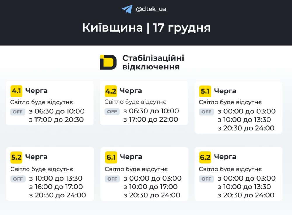 Завтра, 17 декабря, в Киевской области будут действовать длительные отключения света. Об этом сообщает ДТЭК.