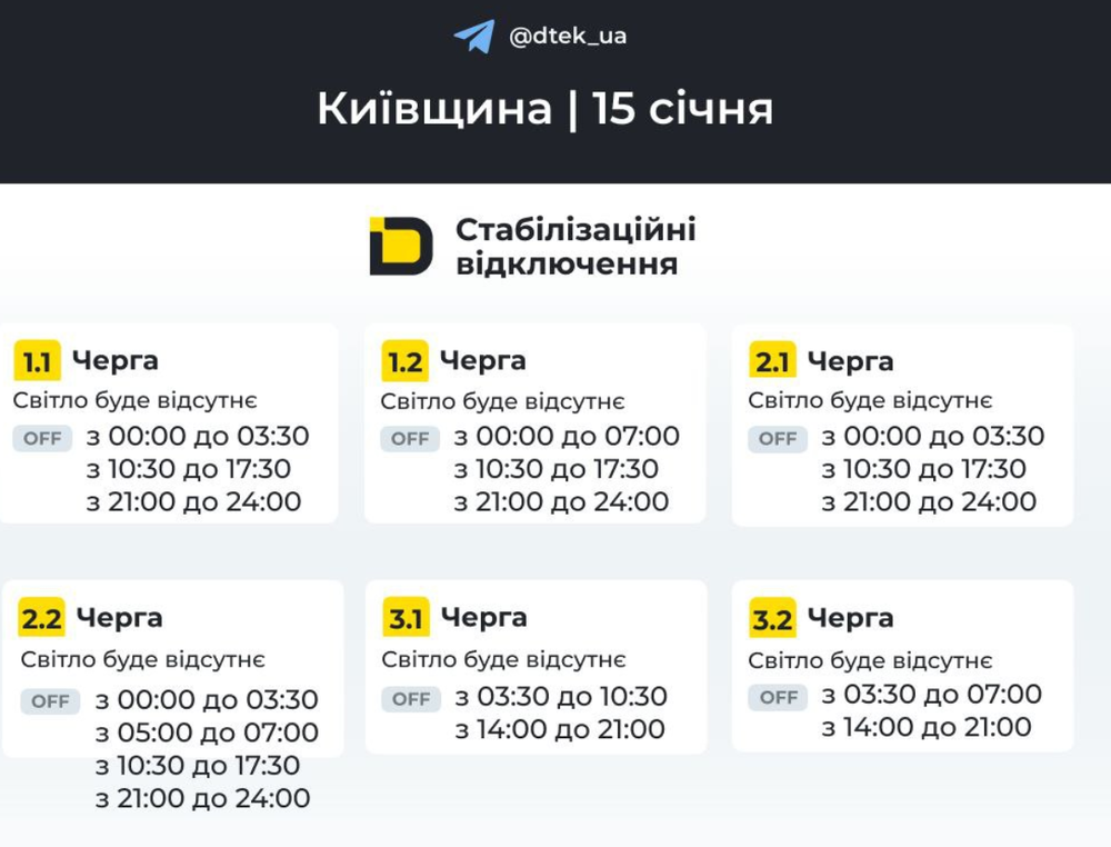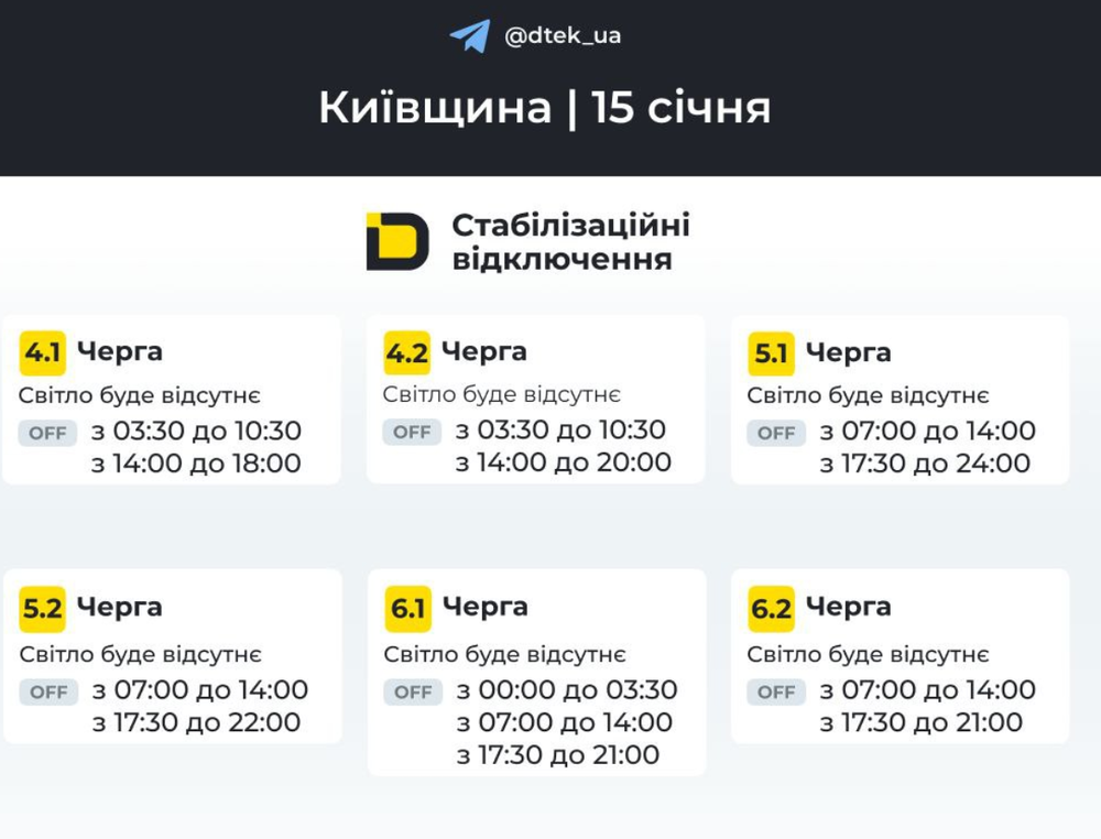 Сегодня, 15 января, в Киевской области введены стабилизационные отключения света. Об этом сообщает ДТЭК.