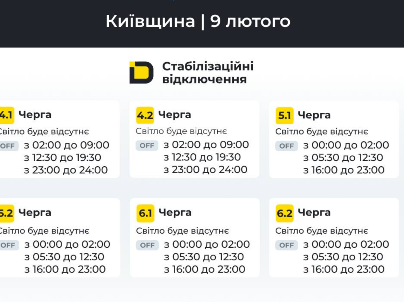 В понедельник, девятого февраля, в Киевской области будут действовать стабилизированные отключения электроснабжения. Об этом сообщает ДТЭК.