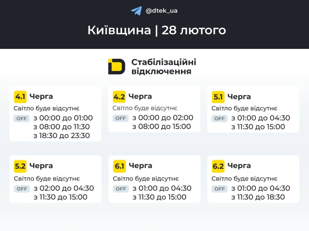 Сегодня, 28 февраля, в Киевской области действуют новые интервалы отключений электроснабжения. Об этом сообщает ДТЭК.