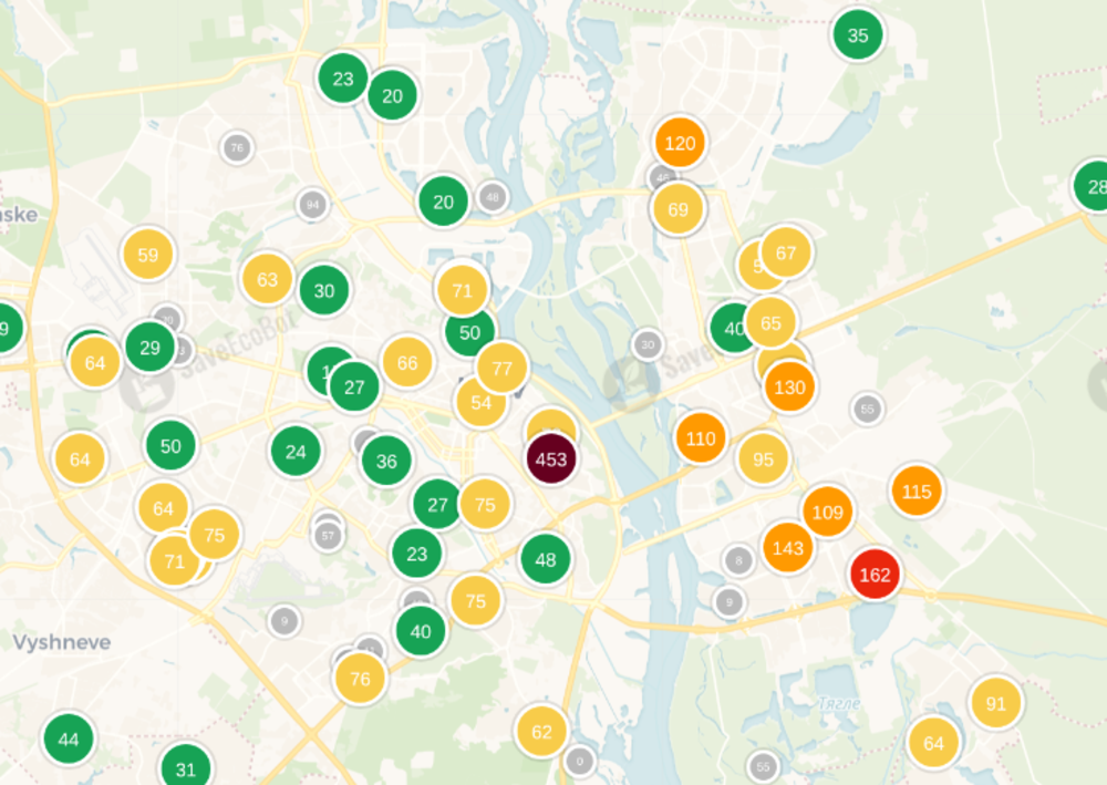 По данным сервиса saveecobot, самый грязный воздух преобладает на Левом берегу города. Именно здесь в нескольких районах поднимается смог, а индексы загрязнения высоки: