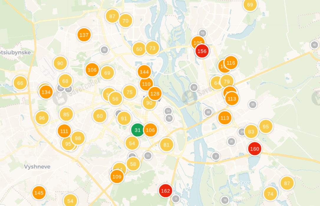 Также вредно дышать на Правом берегу в Голосеевском районе, улица Китаевская, 22 Индекс загрязнения 162