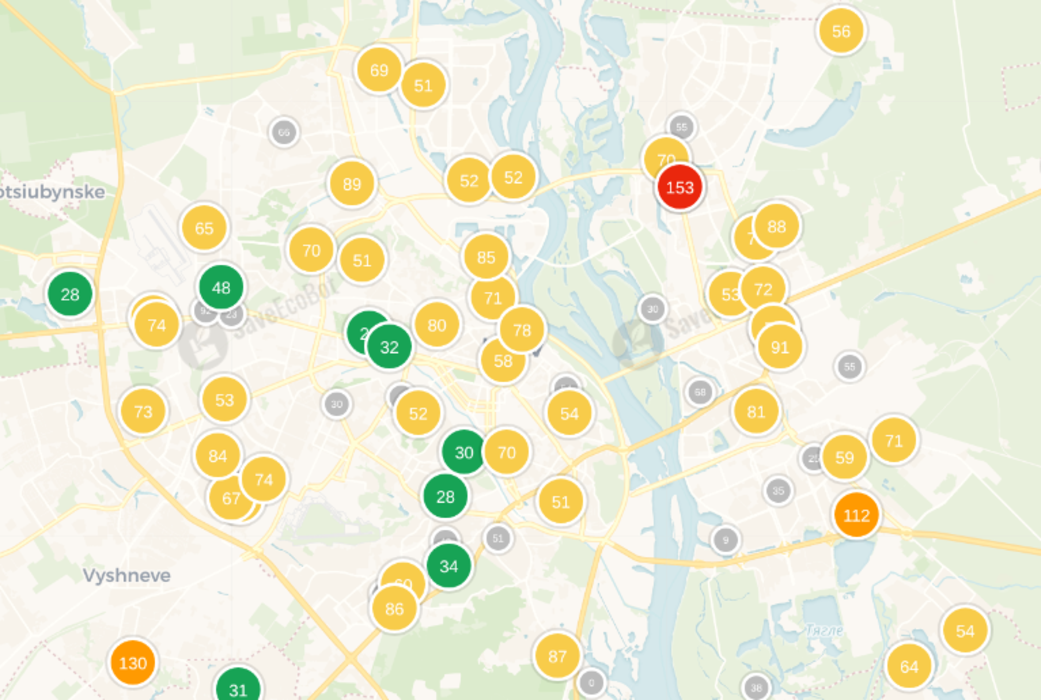 По состоянию на 10.00 на Левом берегу преобладают средние показатели загрязнения. И только в одном районе наблюдается резкое ухудшение состояния воздуха. По данным сервиса мониторинга saveecobot, угроза дыхания сохраняется в Днепровском районе: