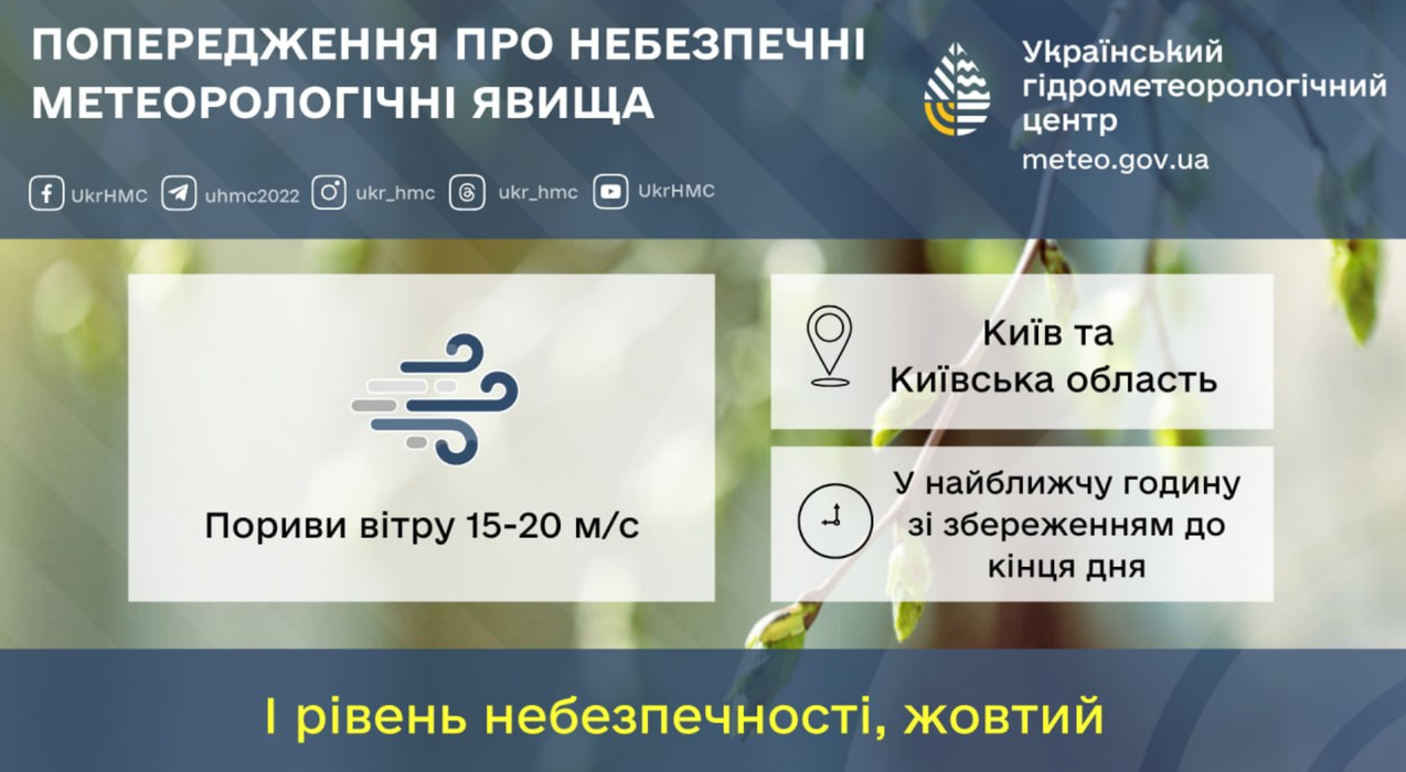"В ближайшее время с сохранением до конца дня 7 апреля в Киеве ожидаются порывы ветра 15-20 м/с", – сообщает Укргидрометцентр, как пишет КГГА.